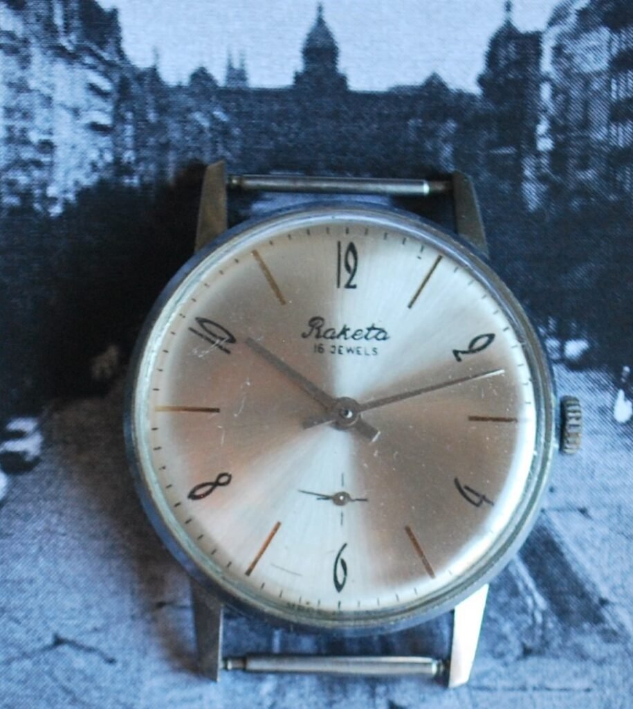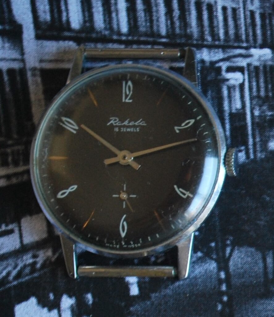 Prueba de la plaza desierta , es la mano con el reloj, la mano no pertenece al fotógrafo , es una composición con alguien que pasaba por allí. Con el paso del tiempo se ha sabido que la marca del Reloj es Raketa , el calibre 2603 y el modelo es el 591028. No es extrañar , la Unión Sovietica producía relojes para todo el bloque del Este.