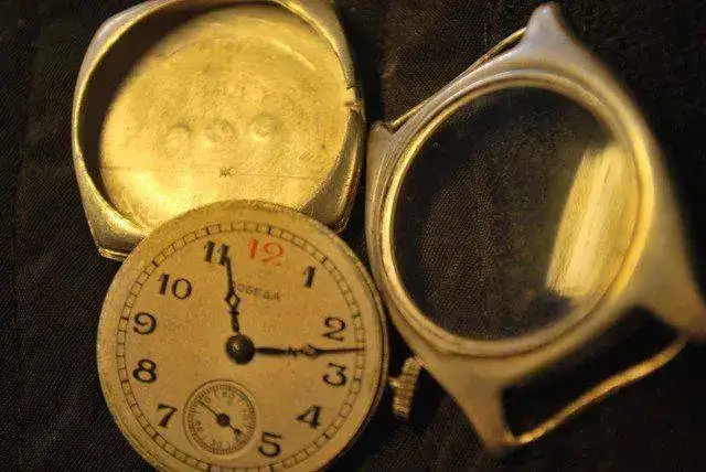 Vista de la esfera, cristal y caja interior con inscripciones.